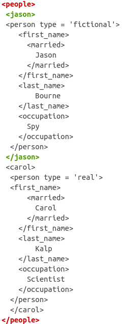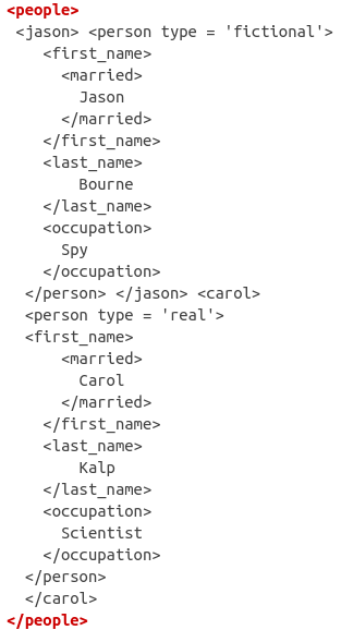 [1] <person type="fictional">\n <first_name>\n <married>\n Jason\n ...