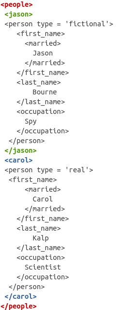 [1] <person type="real">\n <first_name>\n <married>\n Carol\n ...