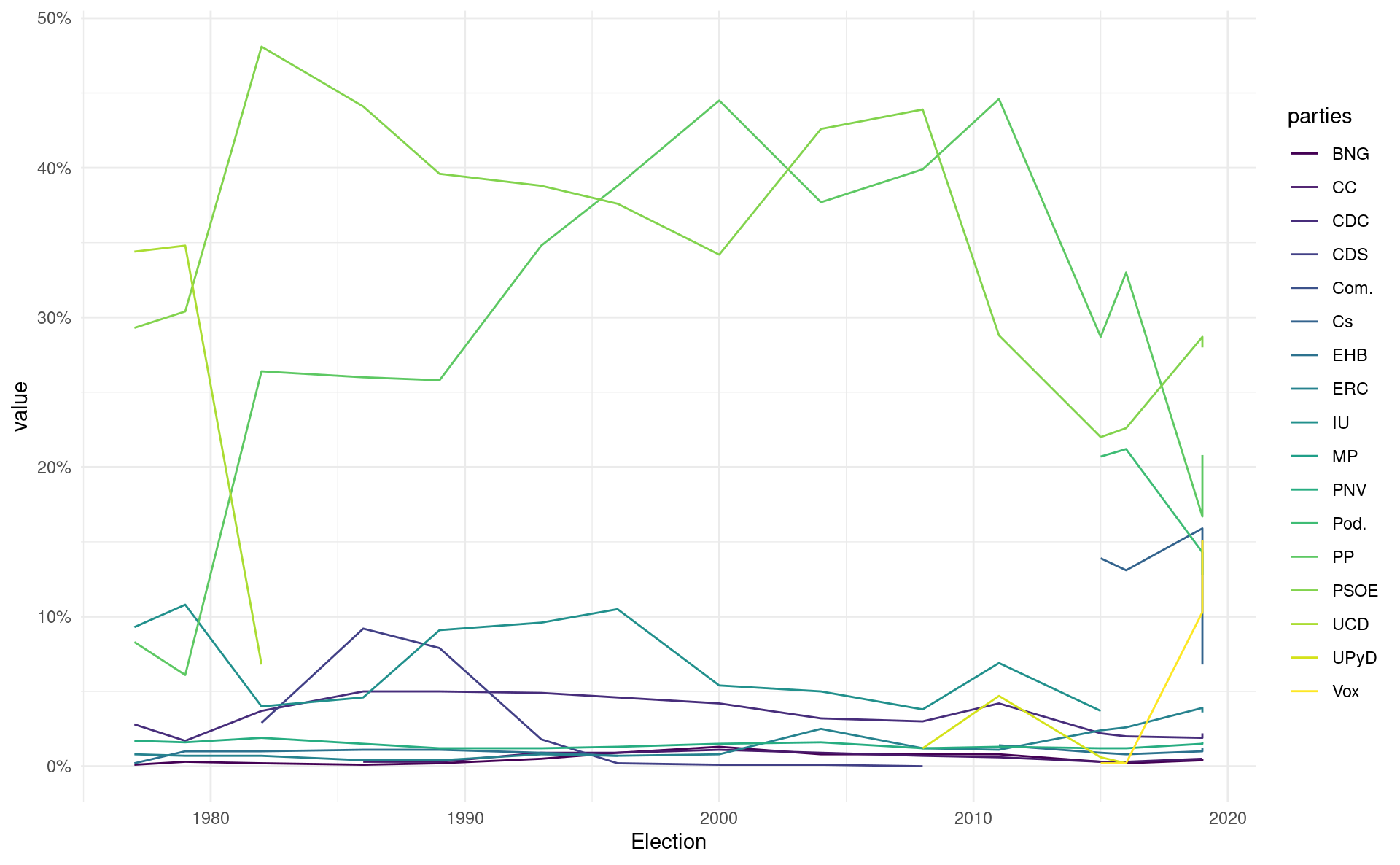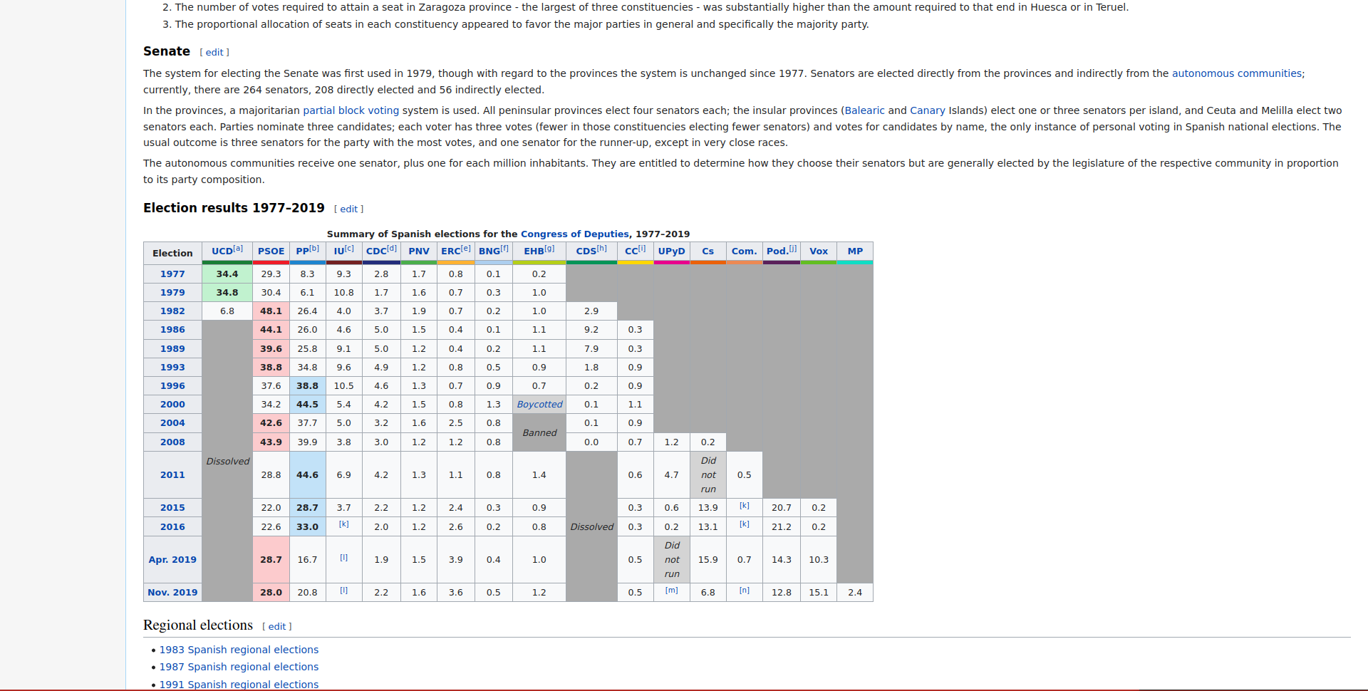 The plot above shows the election results for all political parties in Spain since 1978, all completely scraped from Wikipedia.